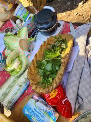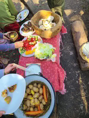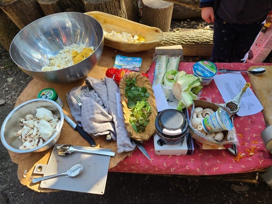 Es gab ein 7-gängiges Menü, zubereitet auf wunderbar wilde Art und Weise: es gab Steinsuppe - gekocht mit heißen Steinen direkt im Topf, Burger auf heißen Steinen gegrillt, einen Gemüsestrudel und Wildkräuterroulade auf dem Rost knusprig gebrutzelt, einen feinflaumigen Kuchen aus dem Dutch oven und einen superleckeren Holder-Pudding. Es war ein Erlebnis der ganz besonderen Art!