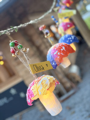 In diesem Jahr entstanden zauberhafte Pilz-Laternen. Dabei sammelten die Kinder ihre ersten Erfahrungen im Kleistern und gestalteten ihre Kunstwerke am Ende liebevoll mit Perlen und Glöckchen.