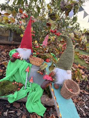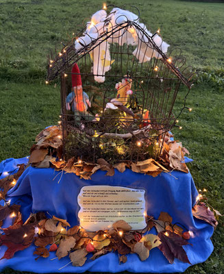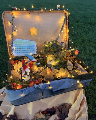 Mit Einbruch der Dämmerung machten sich alle Familien auf den Weg zu den sogenannten Zwergenplätzen. Diese waren großflächig hinter dem Garten in der angrenzenden Wiese verteilt. Alte Koffer verwandelten sich dort in kleine Bühnen und Behausungen für Zwergenfamilien – stimmungsvoll beleuchtet und mit viel Liebe zum Detail gestaltet. An jeder Station wartete ein kleines Gedicht oder eine Geschichte zum Selbstlesen.