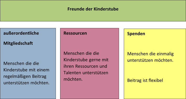 Die Bereiche Vorstand, Geschäftsführung/Pädagogische Leitung, Team und Arbeitsgruppen möchten wir um einen erweitern mit dem „Freunde der Kinderstube“ erweitern.